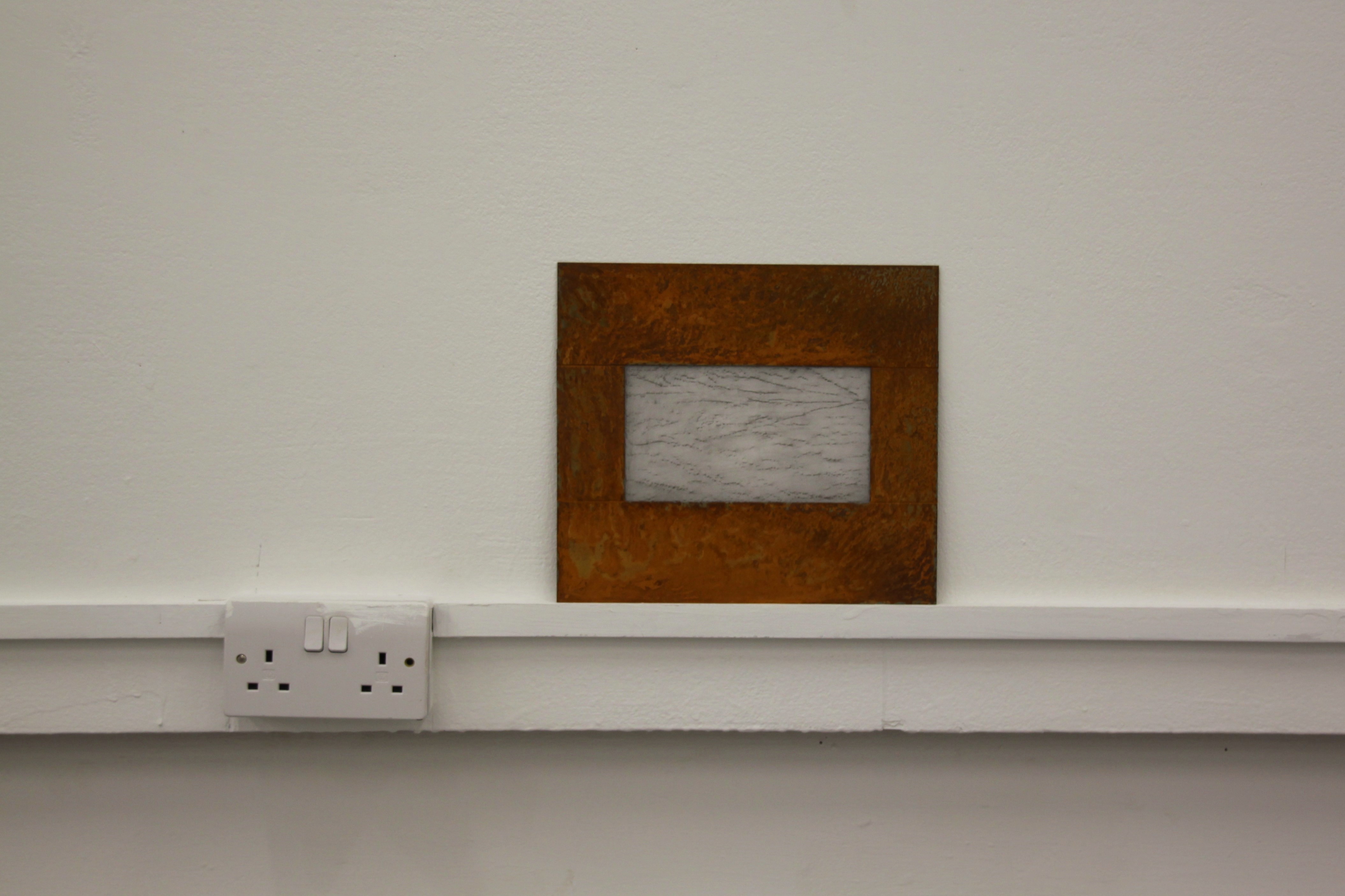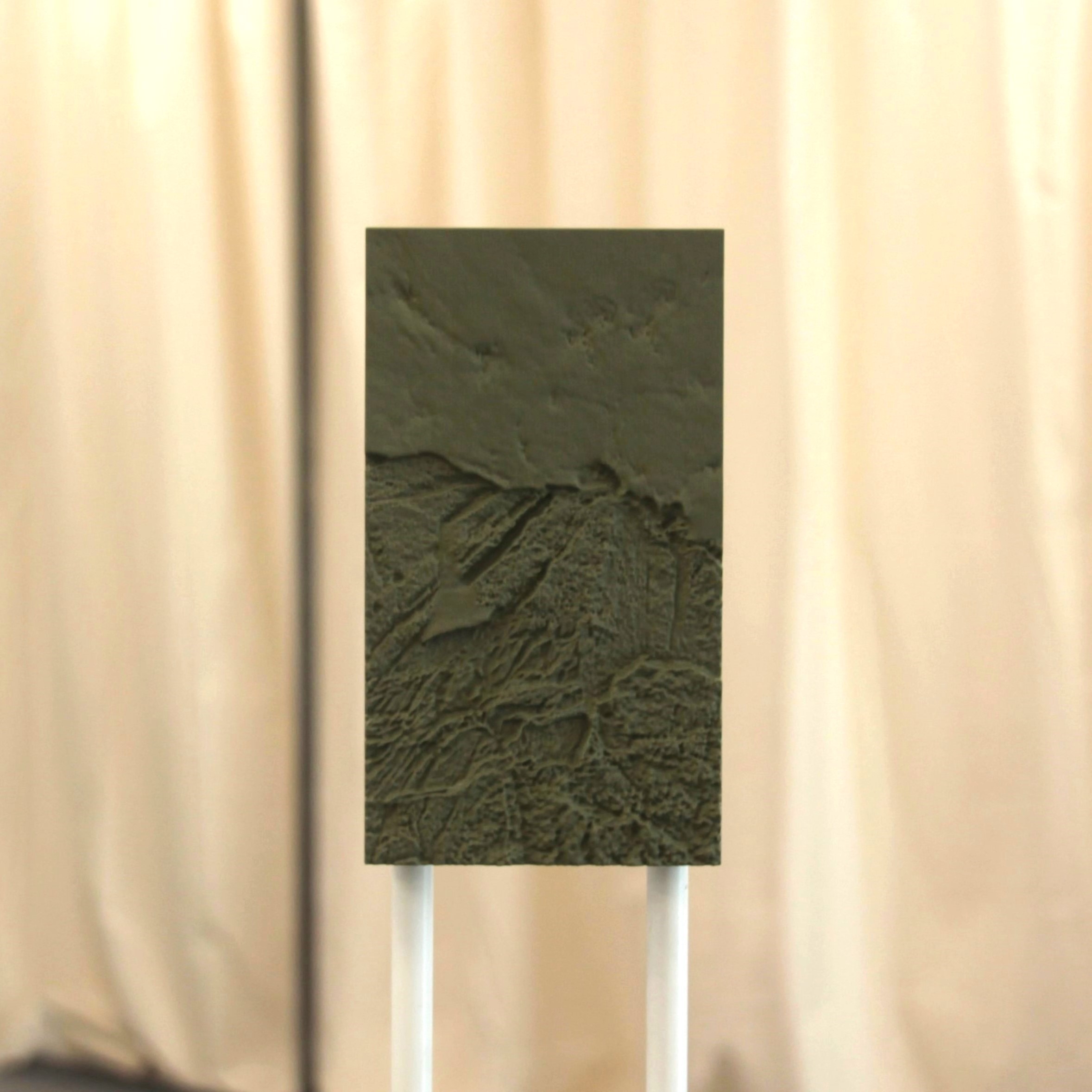 A group of metal and fibreglass structures stand sentry-like in a semi-circle formation seemingly reflecting a device in the corner of the room. Held at the top of these structures are 3D-printed reliefs that contain found memories of Porthcurno sourced from Google Maps, part object, part image, part terrain. Whispering from the corner an EMF detector with clouds on its screen emits a voice repeating a set of words. The imagined environment enters the space through sickly sweet "Little Trees" air fresheners, sand, rust produced from artificial seawater and braided copper wire.